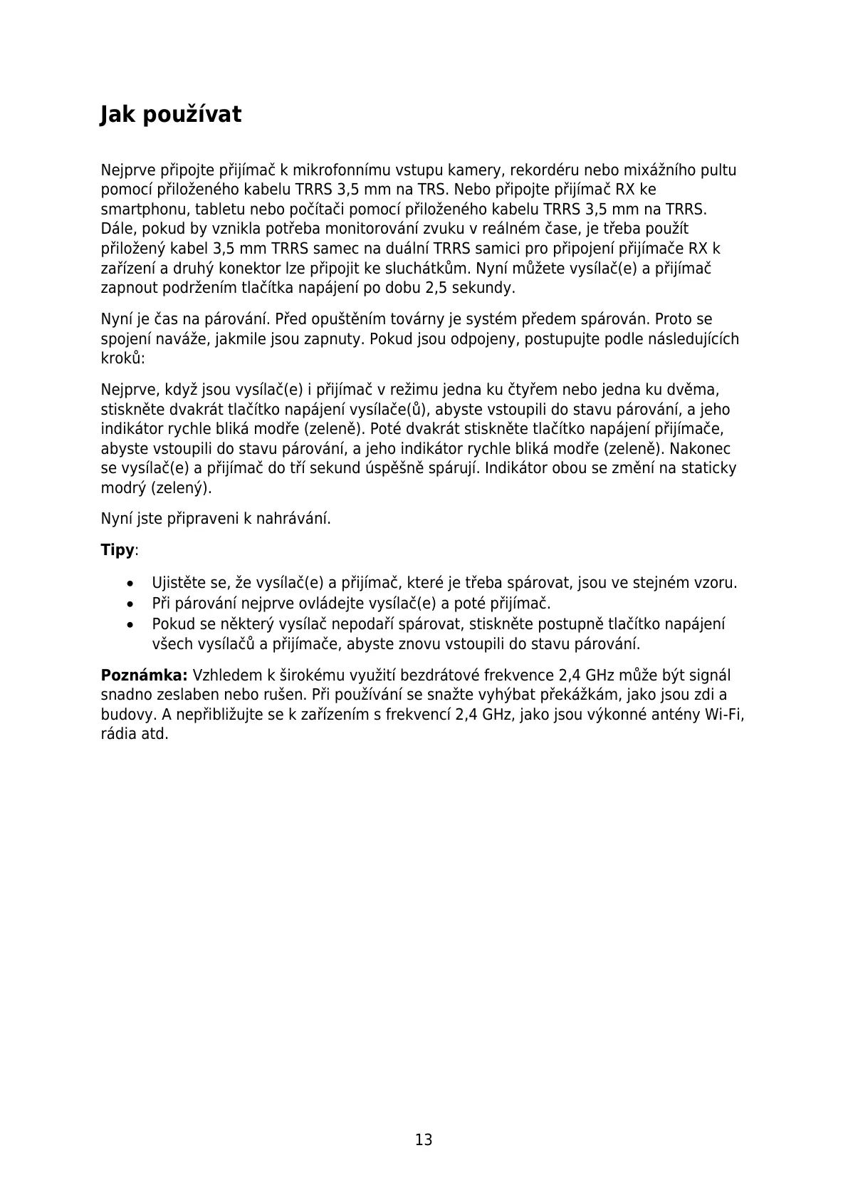 Při párování nejprve ovládejte vysílač(e) a poté přijímač.
