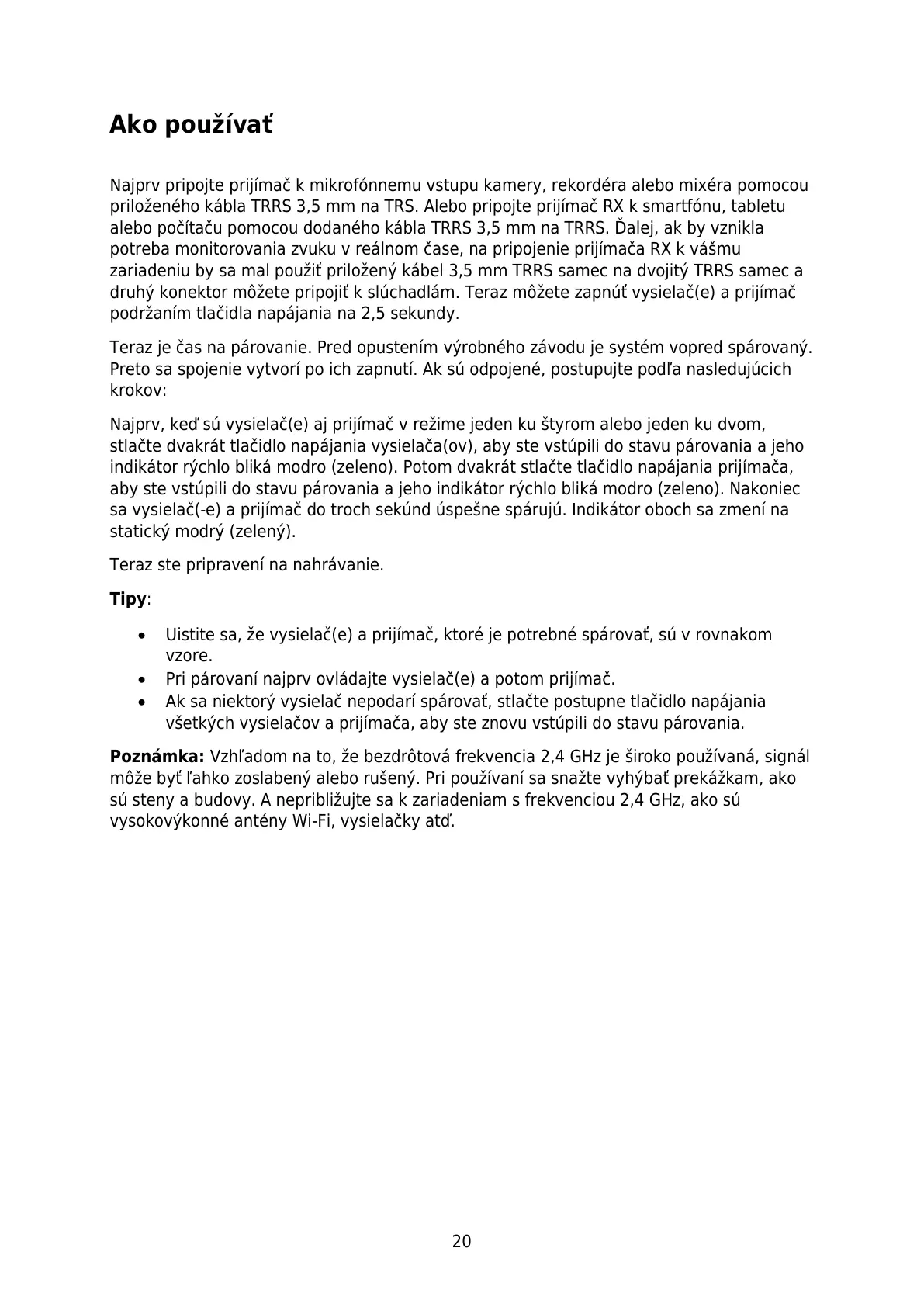 Pri párovaní najprv ovládajte vysielač(e) a potom prijímač.