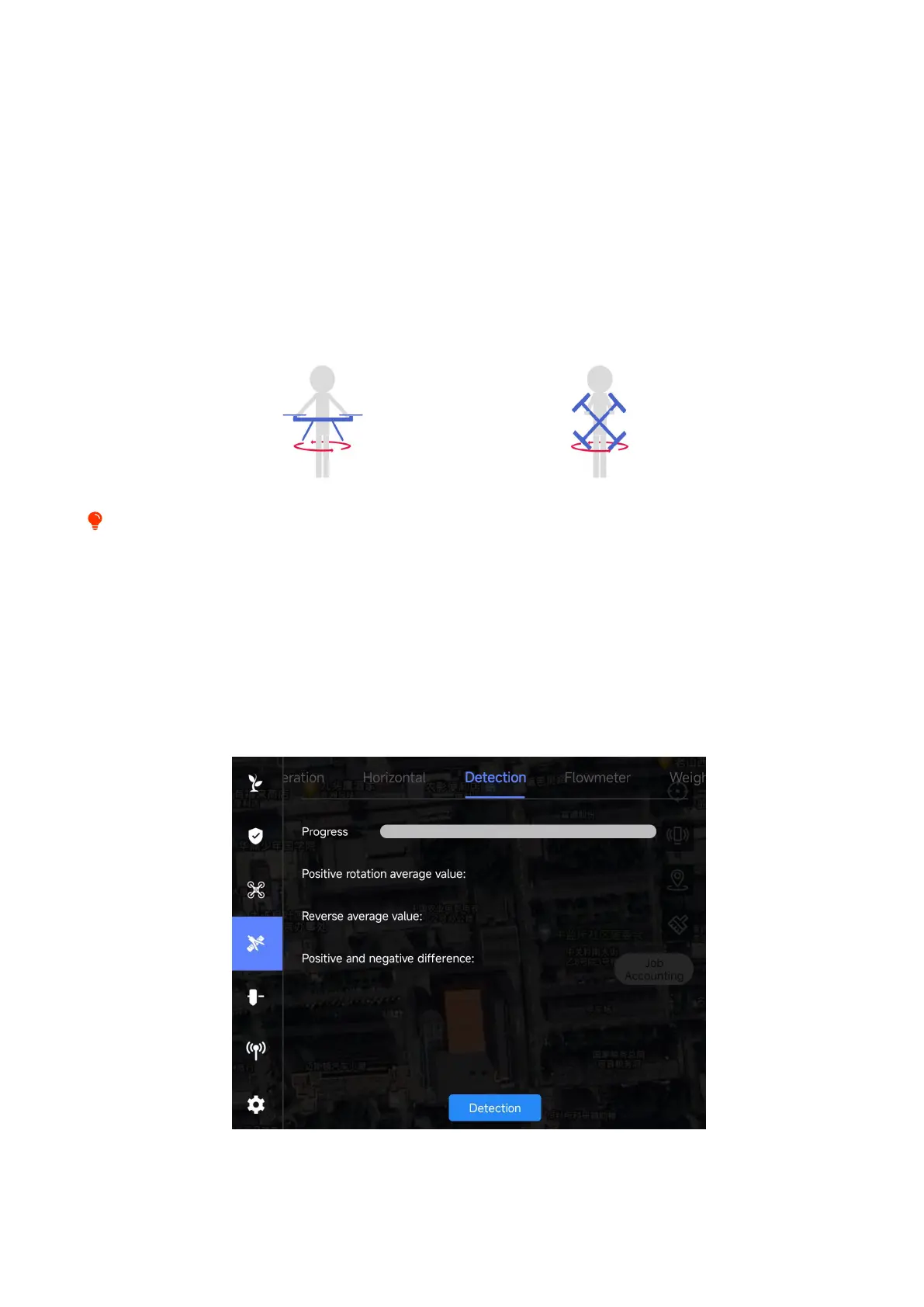 When rotating the aircraft, rotate horizontally at a constant speed for 30 seconds on each axis. If the red light remains on