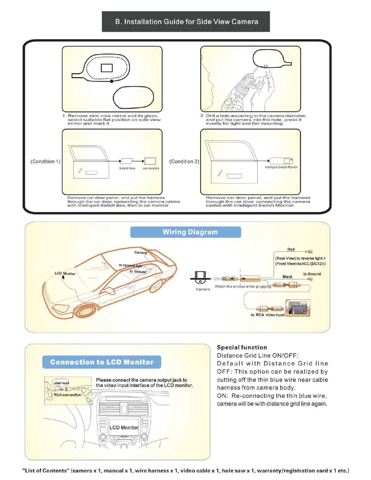 Boyo Vision VTB123HD - Installation Guide for Side View Camera; Wiring Diagram; Connecting to LCD Monitor; Special Functions