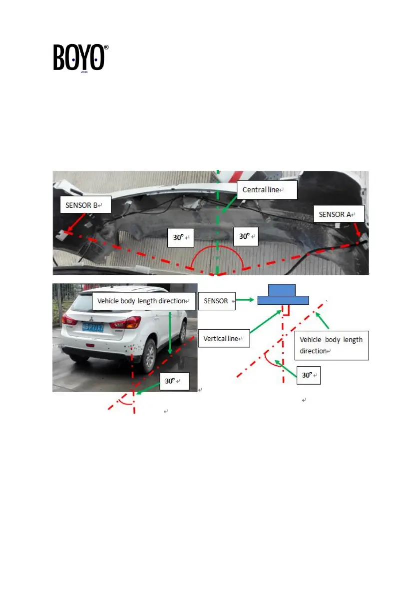 corners of rear bumper shell with an angle of 25° to 35°, at height of
