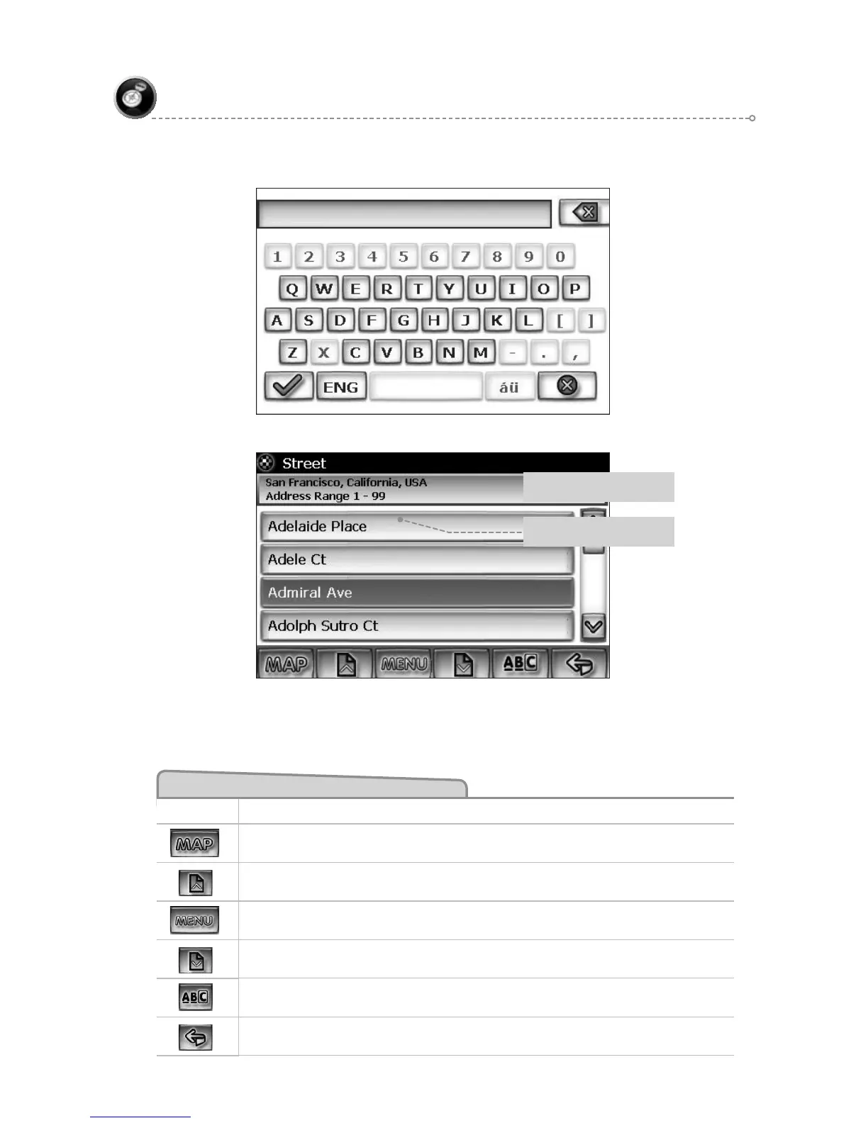 display screen to select a city first, then street, then address number or intersection.