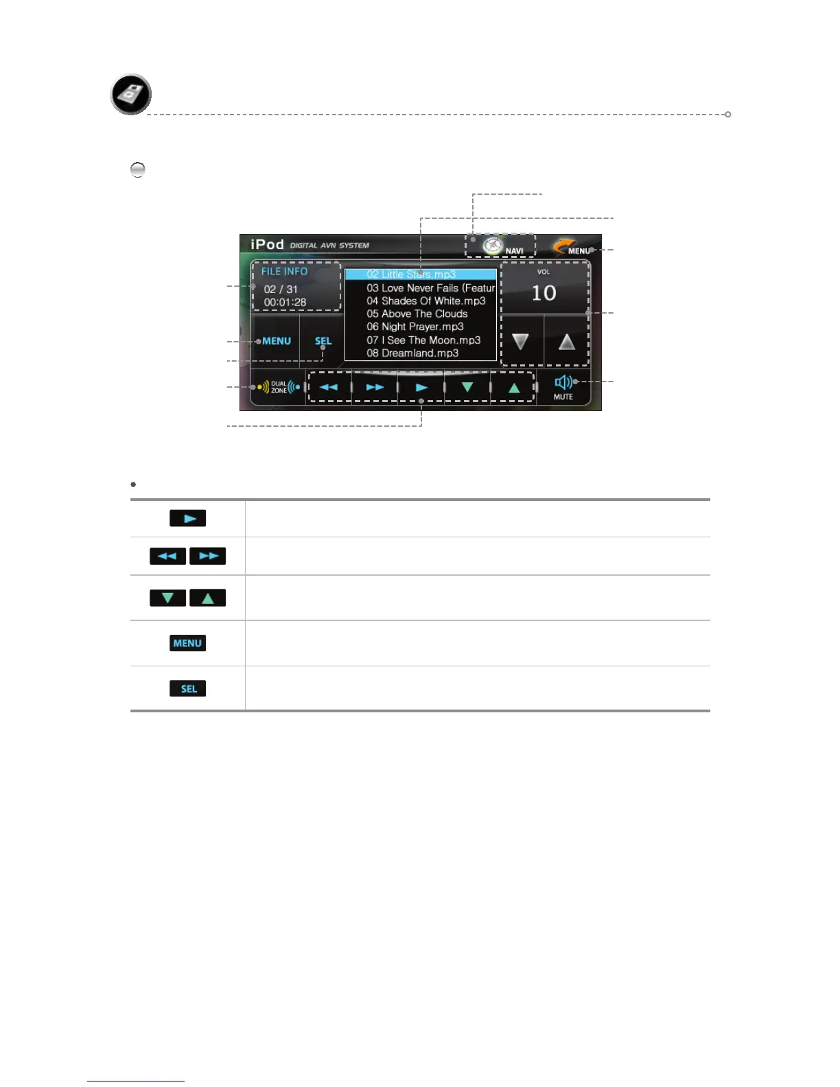 After using the up/down icons to navigate the iPod MENU List, press <SEL> to play the