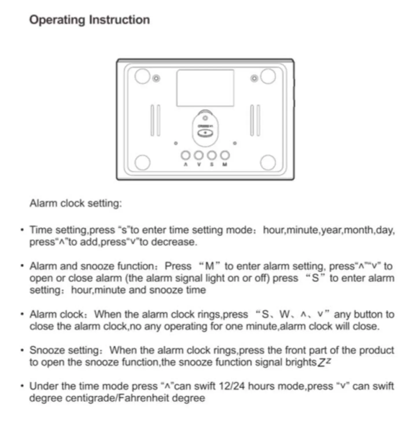 • Alarm and snooze function: Press "M" to enter alarm setting. press-tev- to