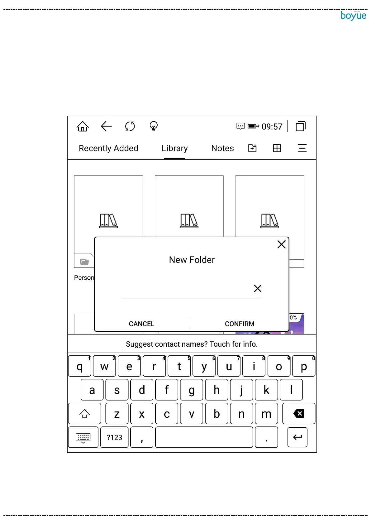 Click the "New Folder" button on the bookshelf interface, and the folder naming