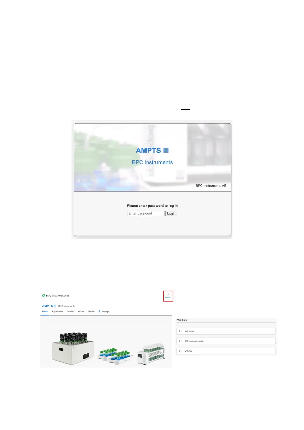 page (Figure 13). In the Log in page, the default password bpc needs to be added.