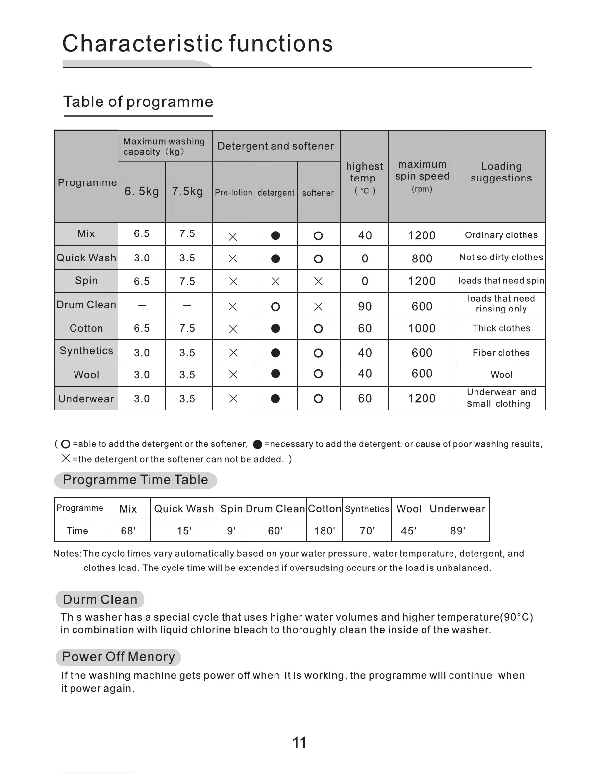 BPL BFAFL65WX1 - Characteristic Functions; Table of Programmes; Programme Time Table; Drum Clean Cycle