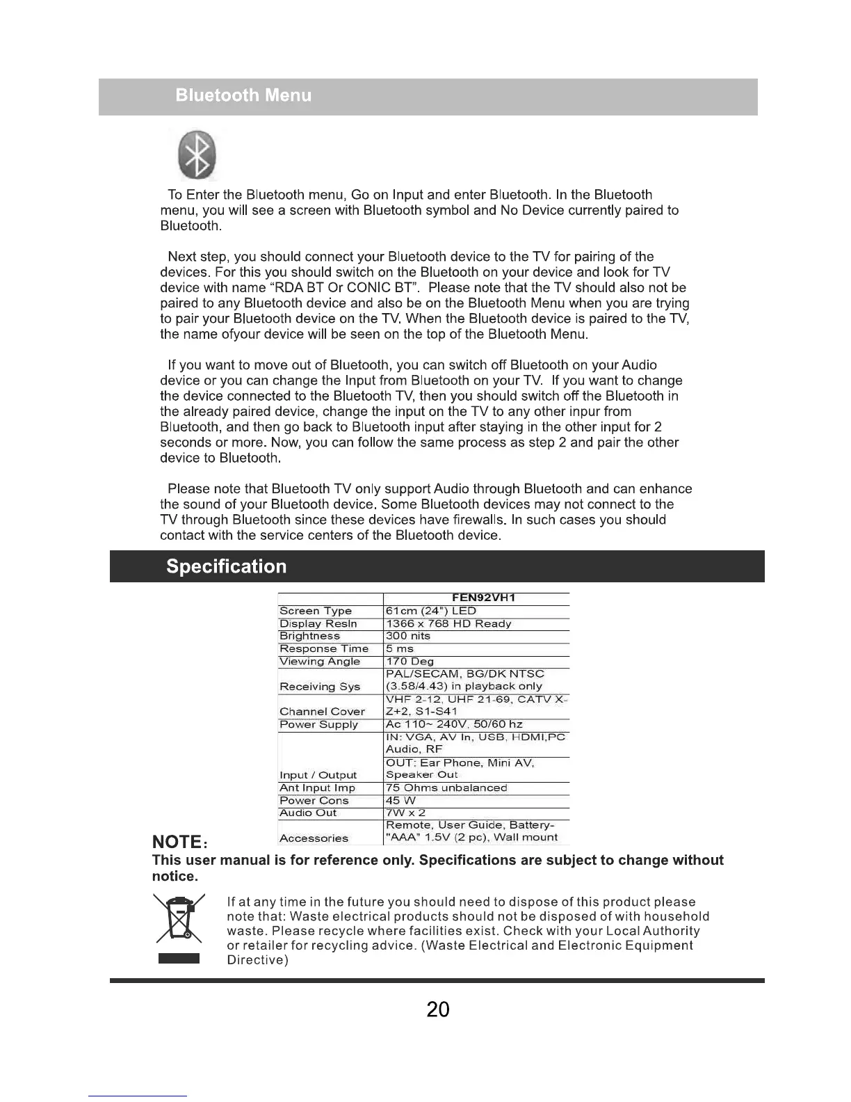 BPL FEN92VH1 - Bluetooth Menu; Product Specifications
