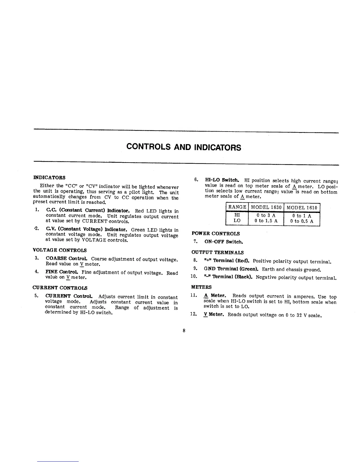B+K precision 1610 - Indicators; Voltage Controls; Current Controls; Power Controls