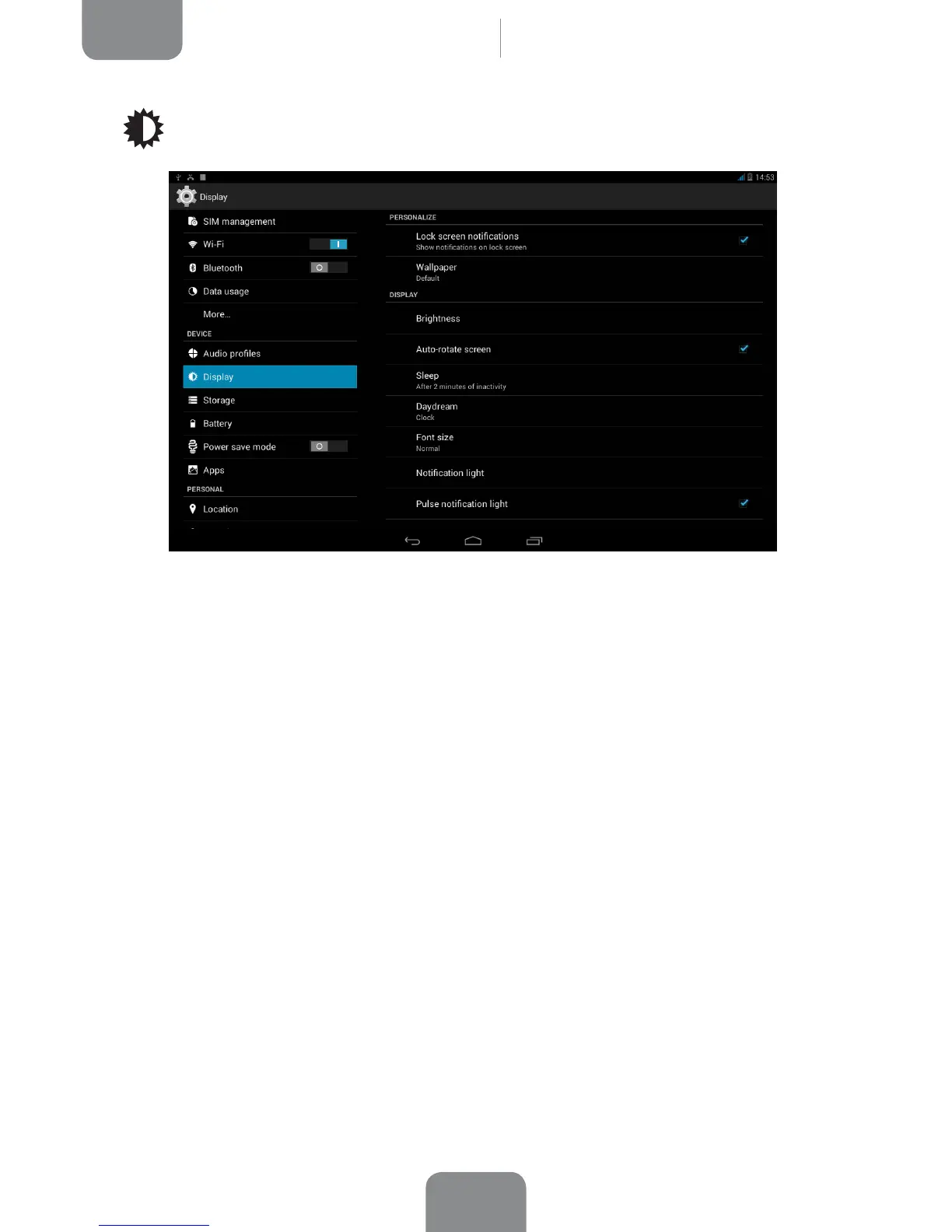 Brightness: Adjust the screen brightness level.