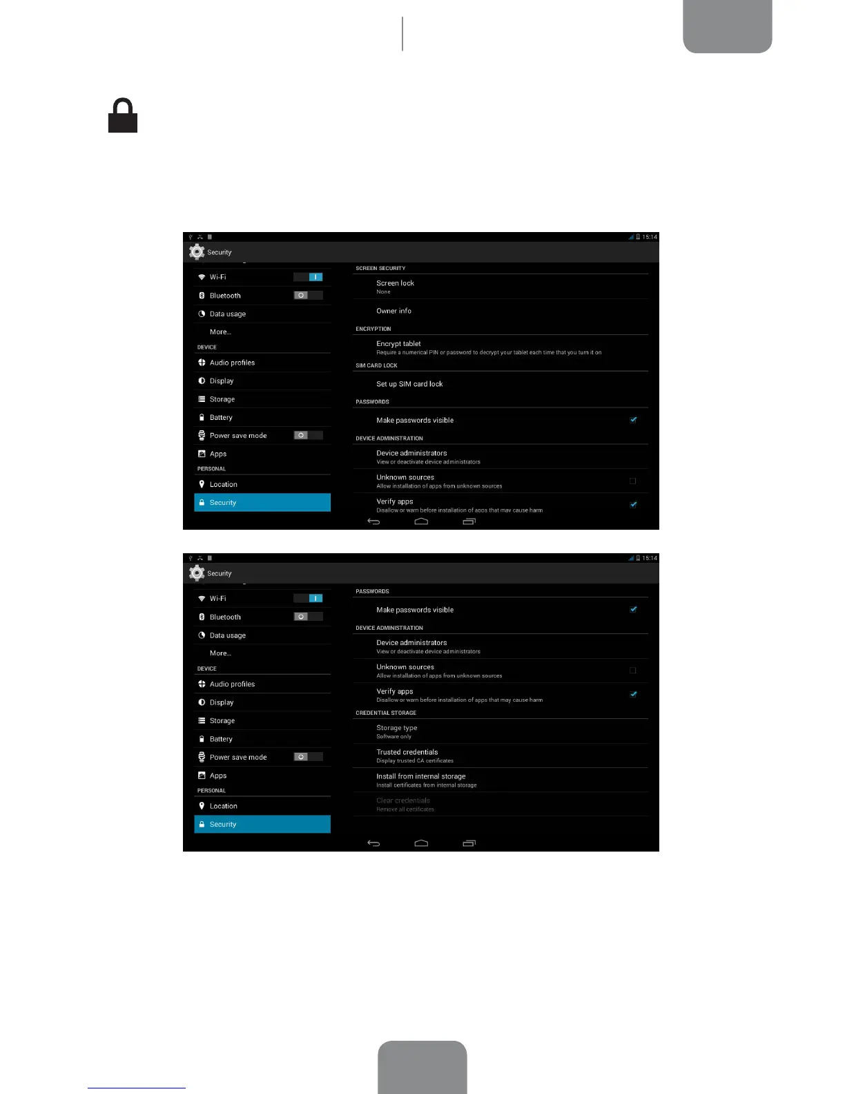Here you can congure your tablet’s Screen lock (i.e. the type of lock and the owner
