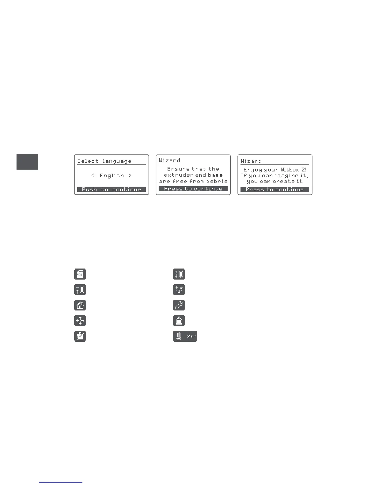 panel will light up and the initial configuration of your Witbox 2 will be displayed.