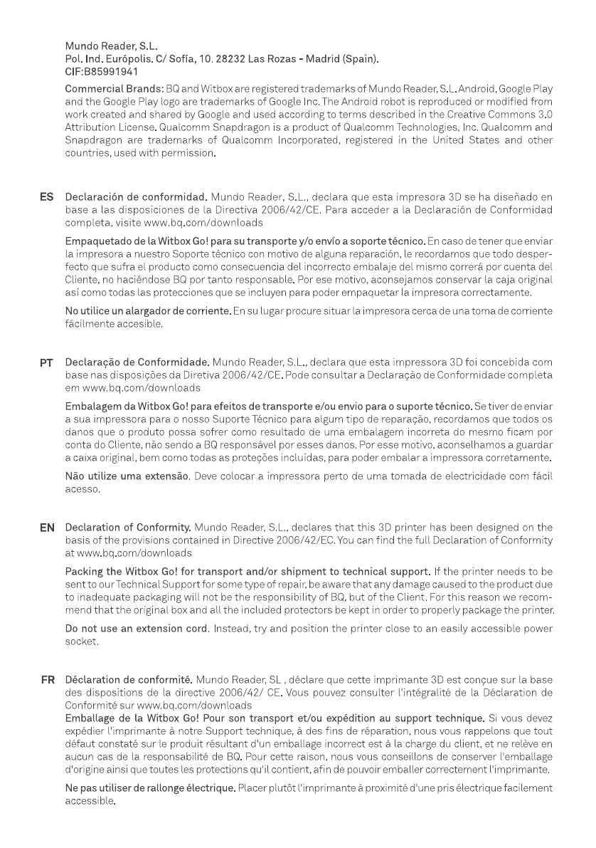 bq Witbox Go! - Declaration of Conformity and Usage; Packing for Transport and Technical Support; Power Cord Usage Recommendation
