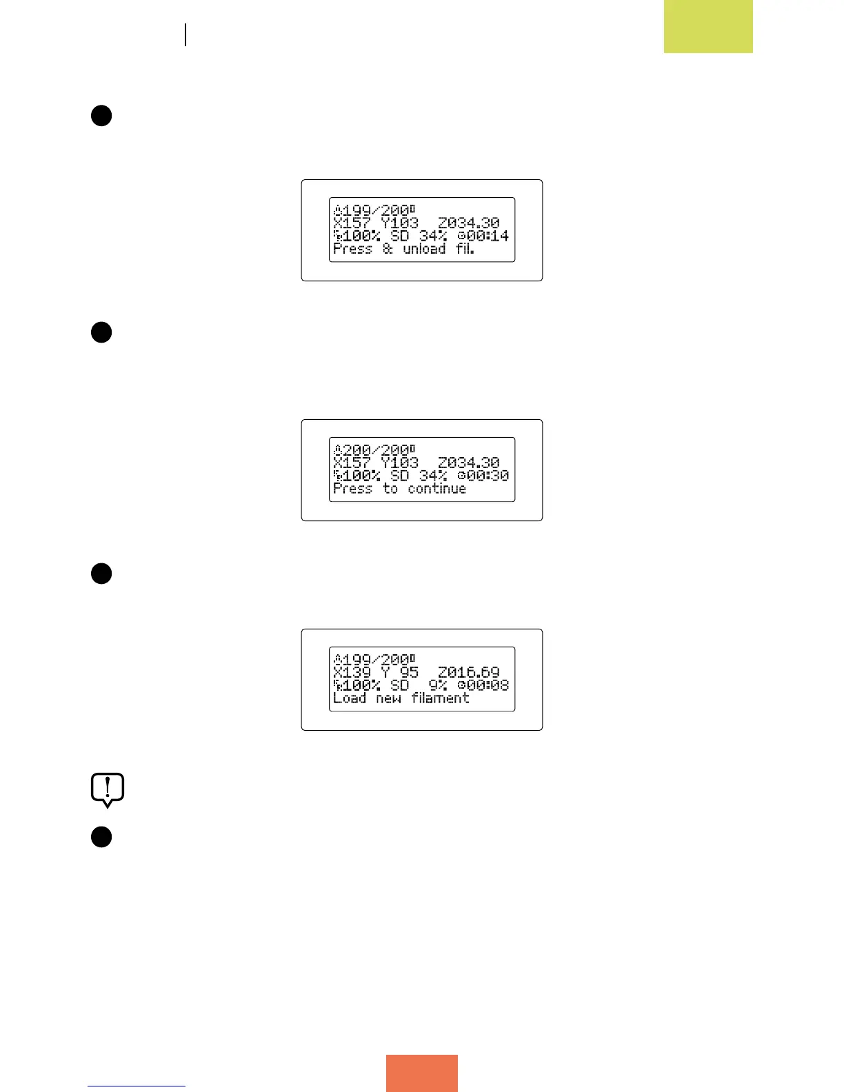 To change the lament during printing, press the control wheel and do the following: