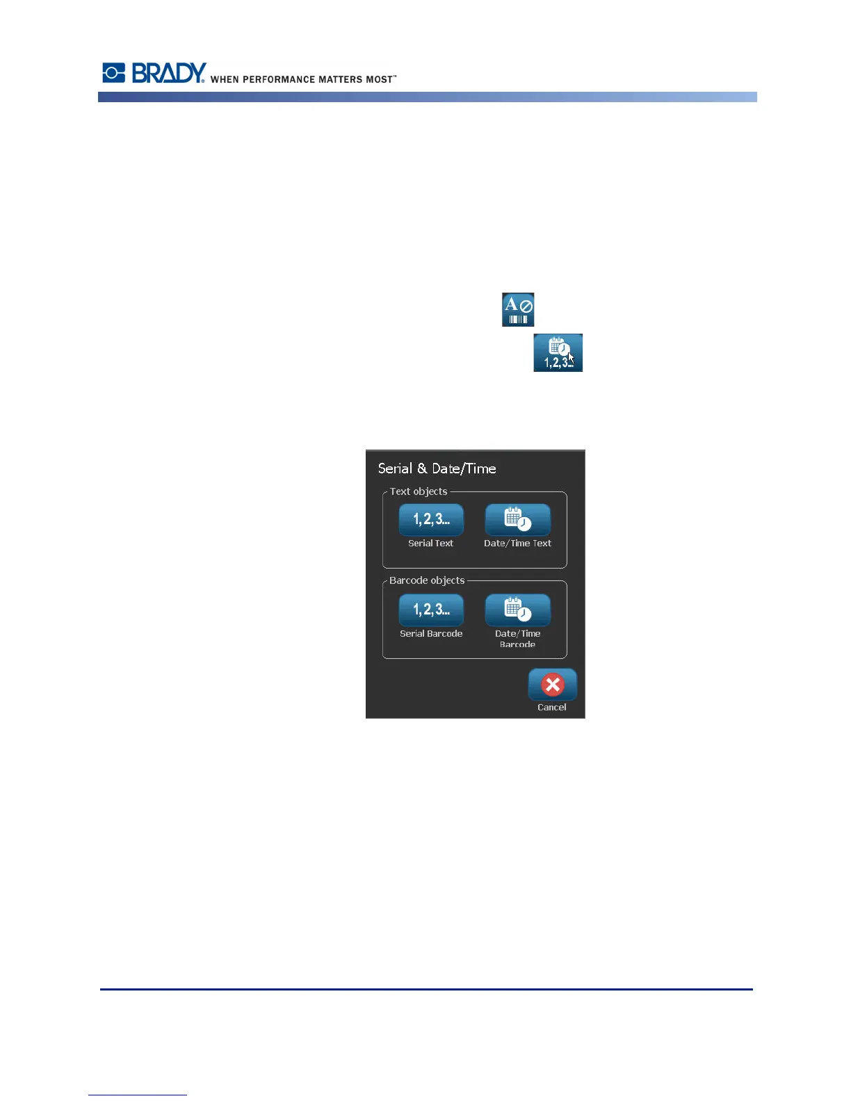 3. In the Serial & Date/Time dialog box, touch either Date/Time Text or Date/Time Barcode,