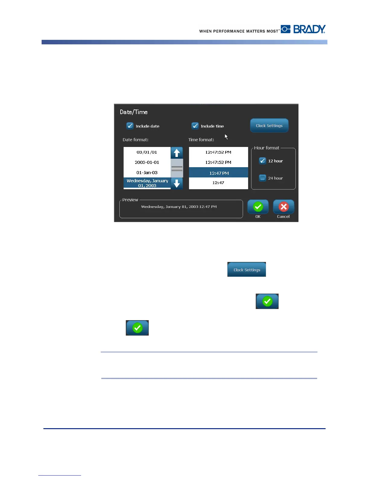 12. Touch OK again to exit the Date/Time dialog box and place the date and/or time