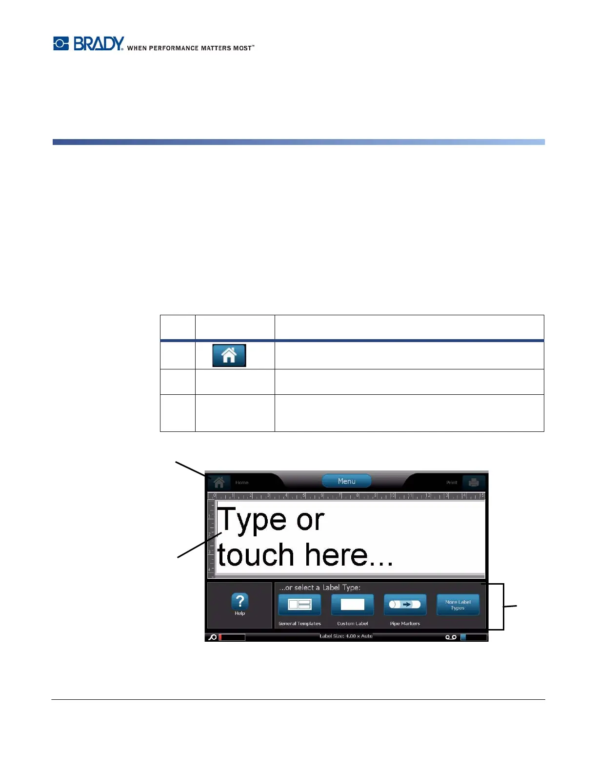 The Home page automatically displays when you first start the printer. The sections of the