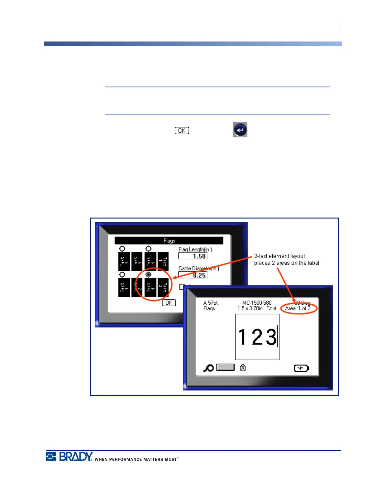 In a 2-text element flag layout, you enter text in two separate areas. Use the [Alt + Next Area/