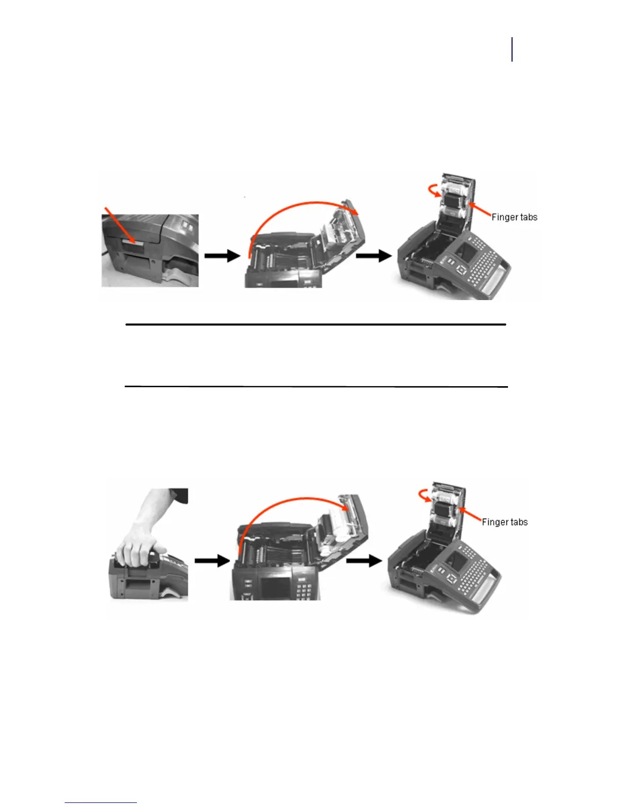 1. Pull up on cover latch 2. Open the cover. 3. Grasping finger tabs of cartridge,