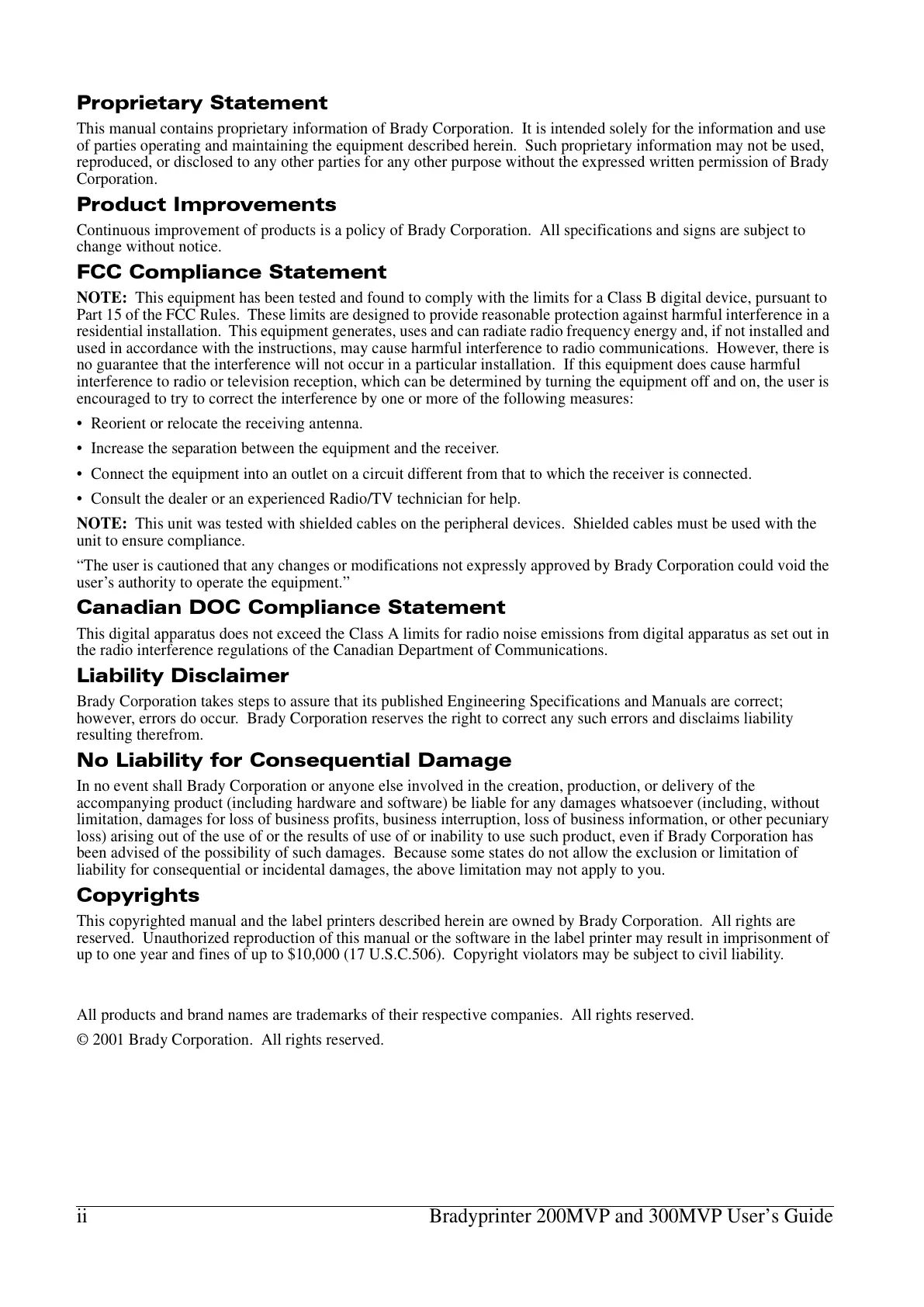 ii Bradyprinter 200MVP and 300MVP User’s Guide
