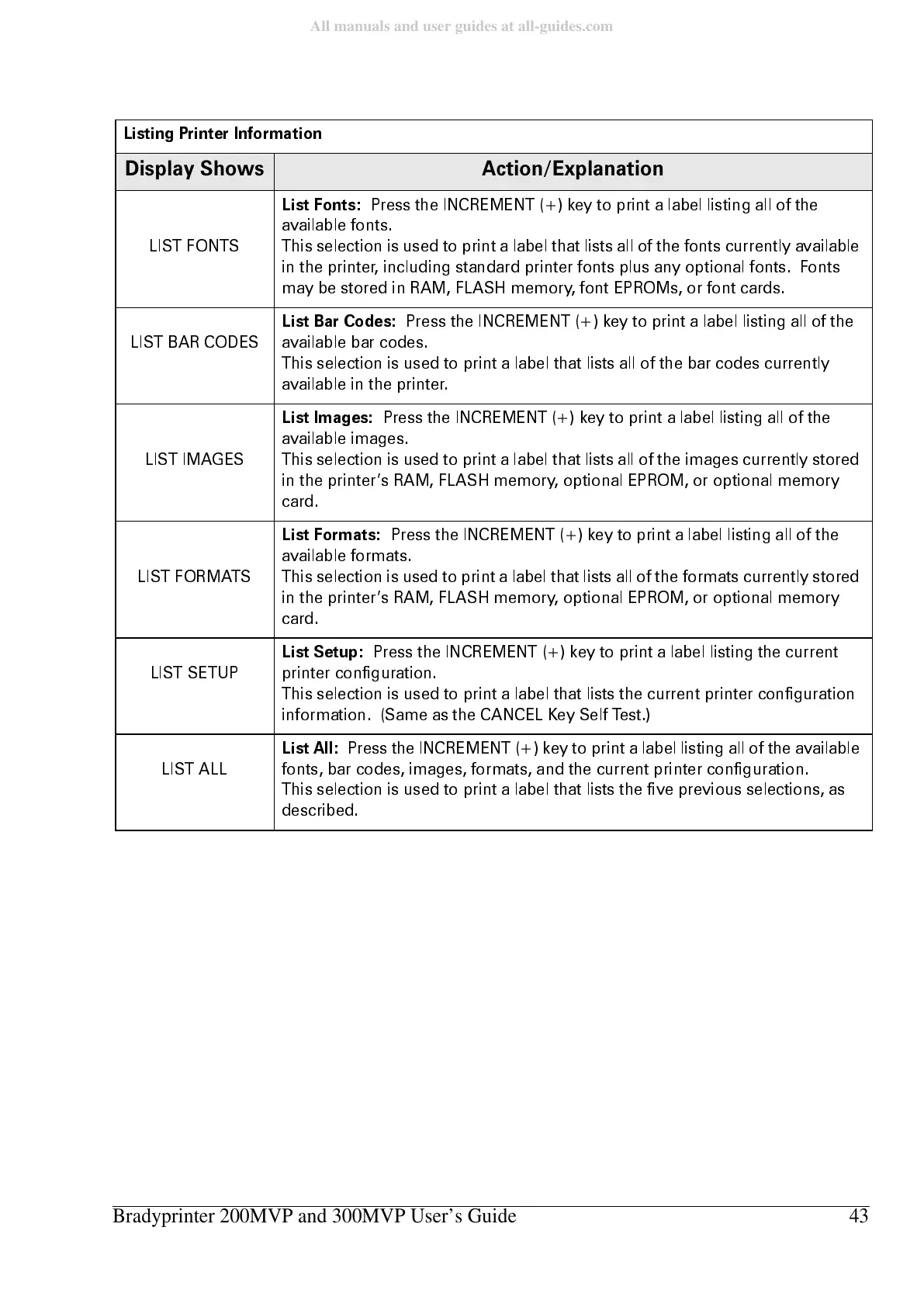 3UHVVWKH,1&5(0(17NH\WRSULQWDODEHOOLVWLQJDOORIWKH
