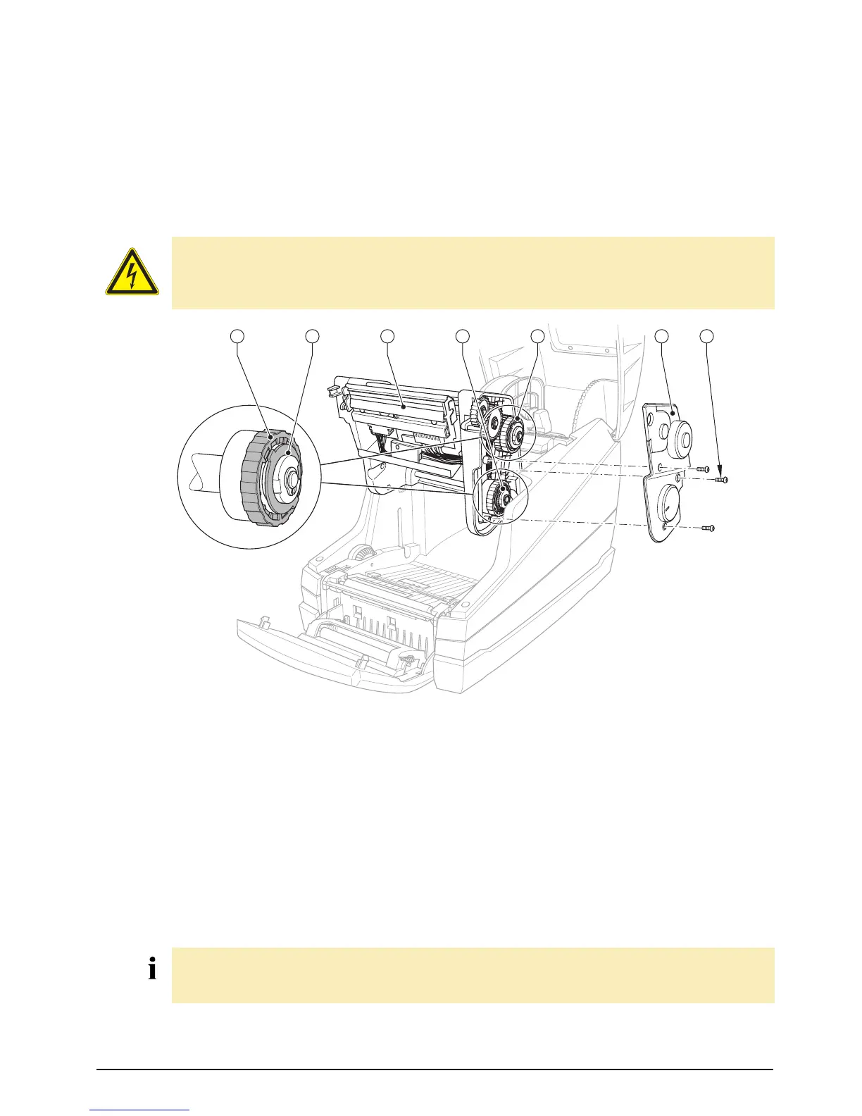 1. Hinge up the printhead assembly (3), unscrew the three screws (7) and remove the cover (6).
