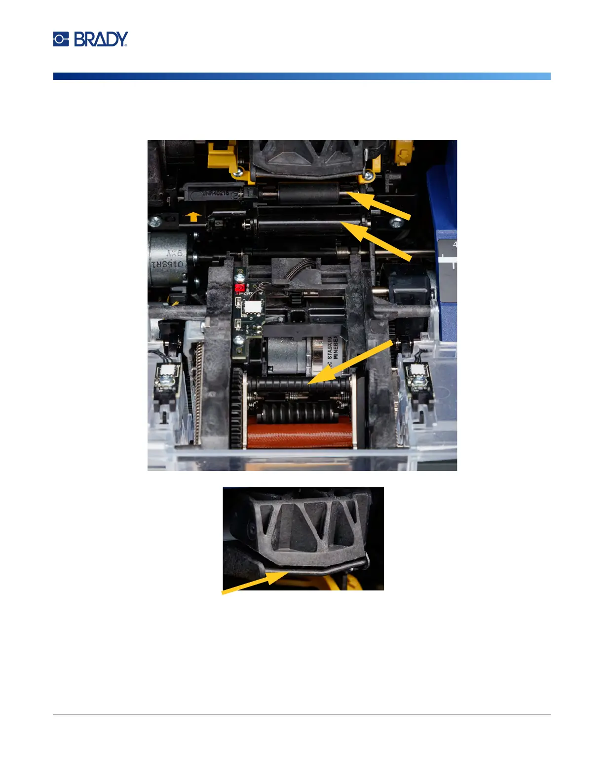 6. Using the moistened swab, clean the three rollers shown below. Make sure each roller is free