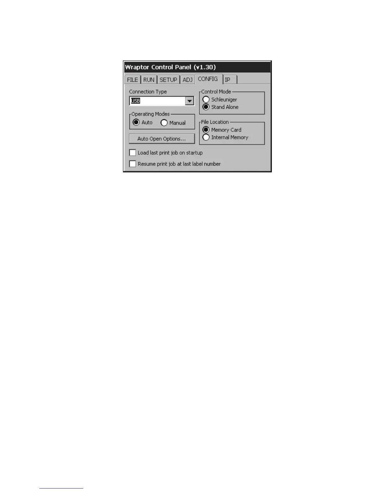 The Config tab menu (Figure 21) allows you to set the Wraptor printer configuration. For example, the