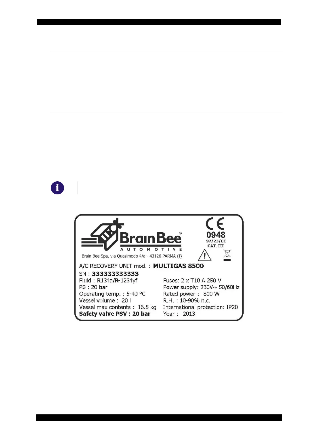 The characteristic data of the equipment are indicated on the specific data plate applied onto the