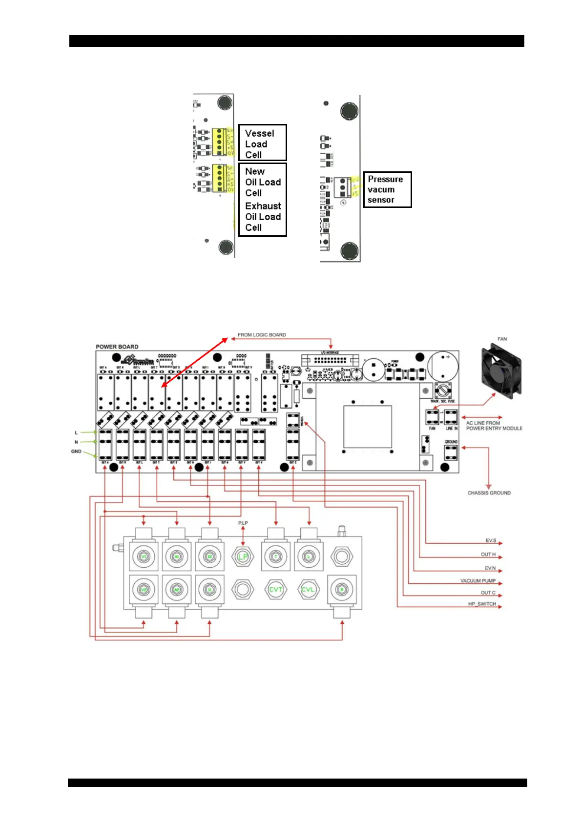 Detail of the connectors connecting to the load cells (gas, new and exhausted oil) and the