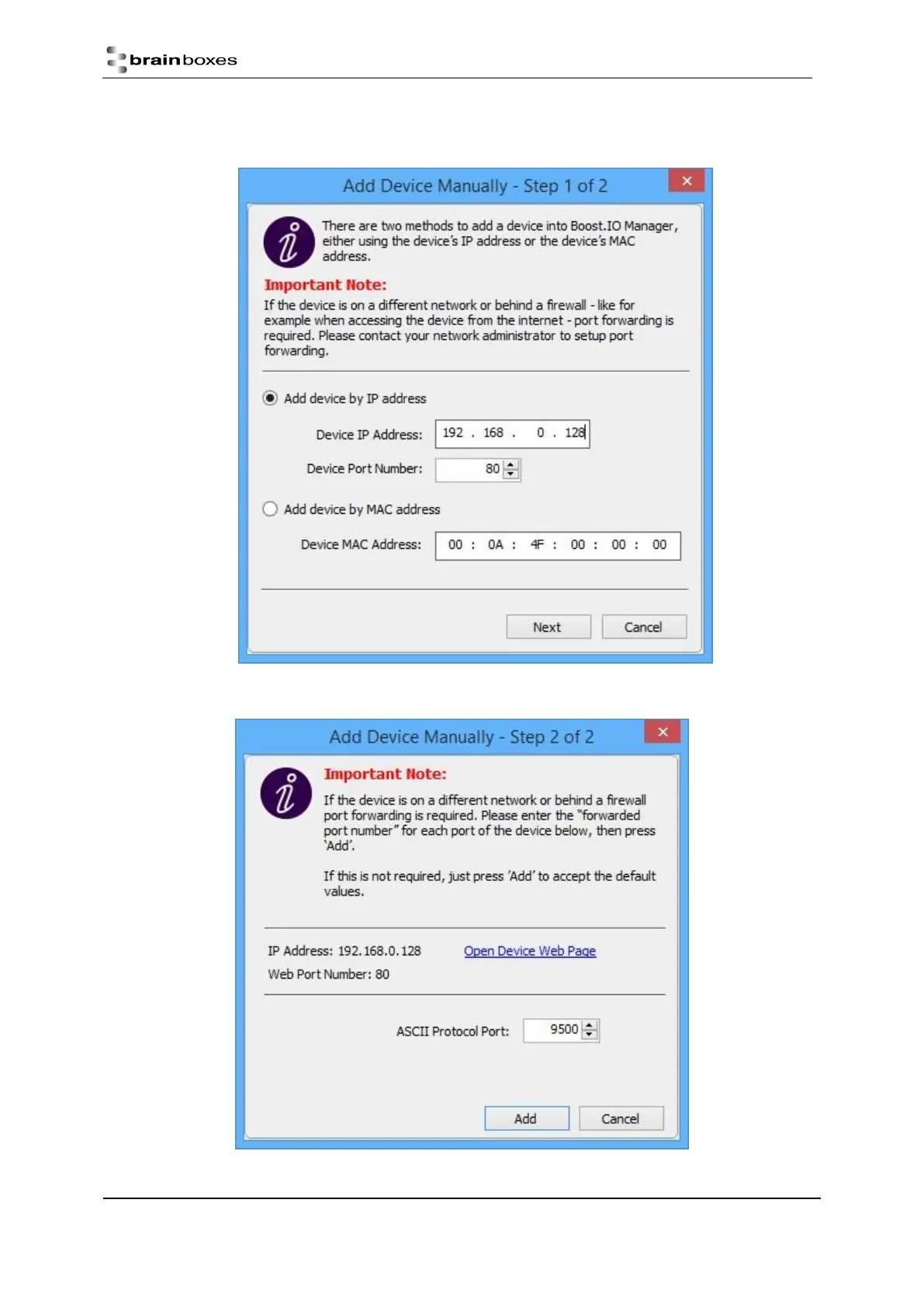 3. Enter the IP address and port number of the device into the Device IP Address box the click the ‘Next’