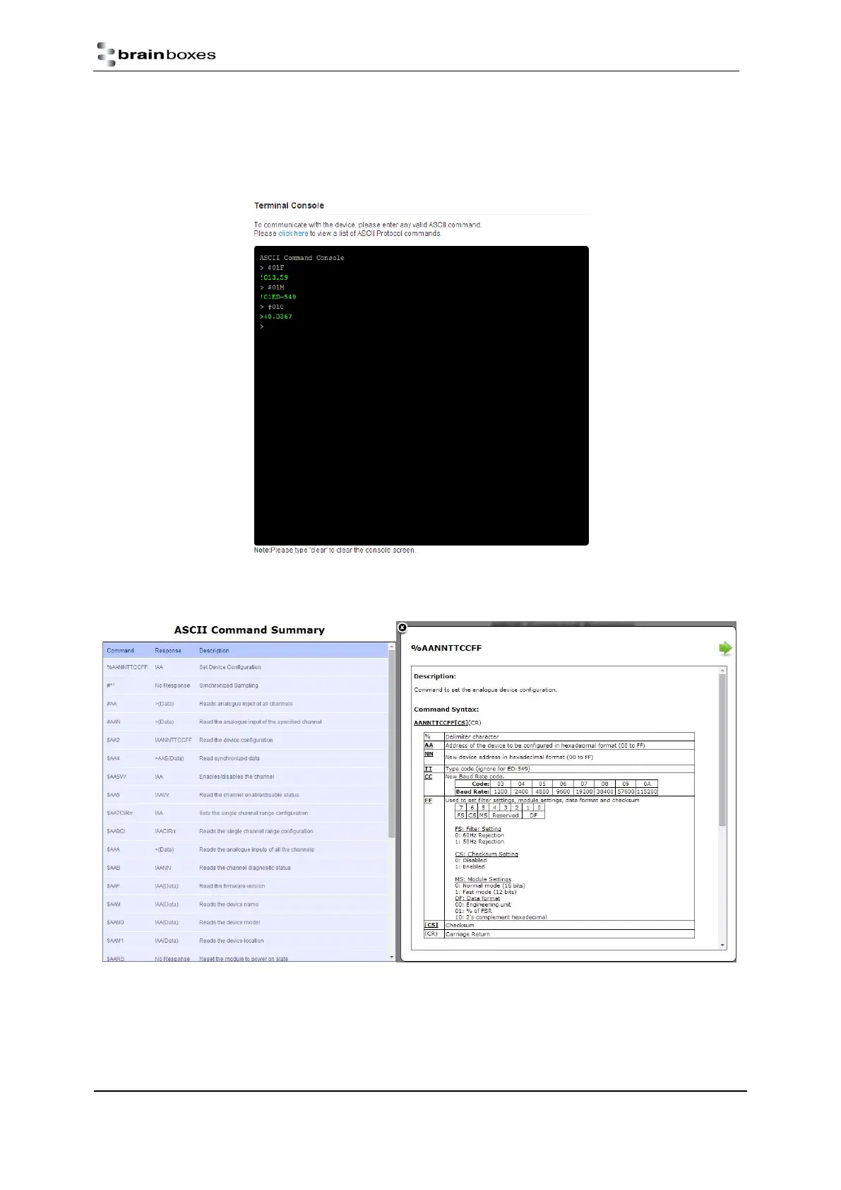 The Console Page contains the console window which allows ASCII commands to be sent straight to the device