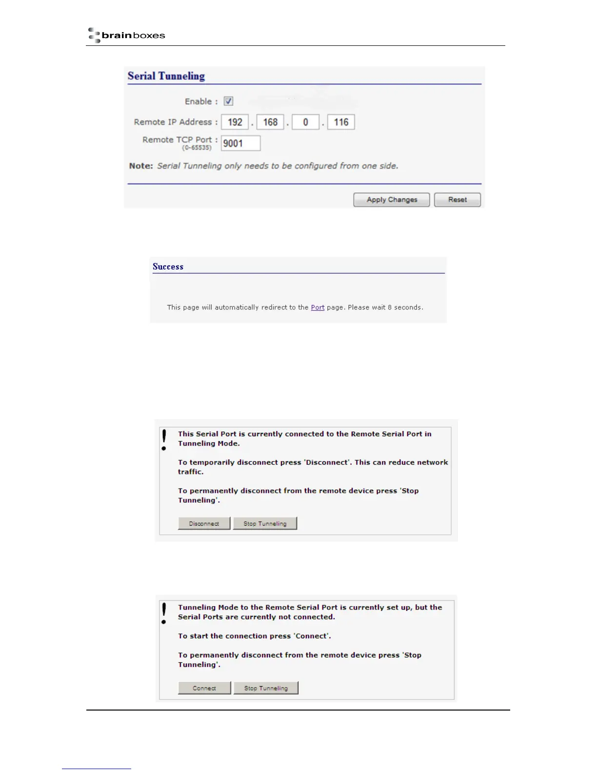 7. On the Local device port webpage you will see displayed the device tunnelling section with