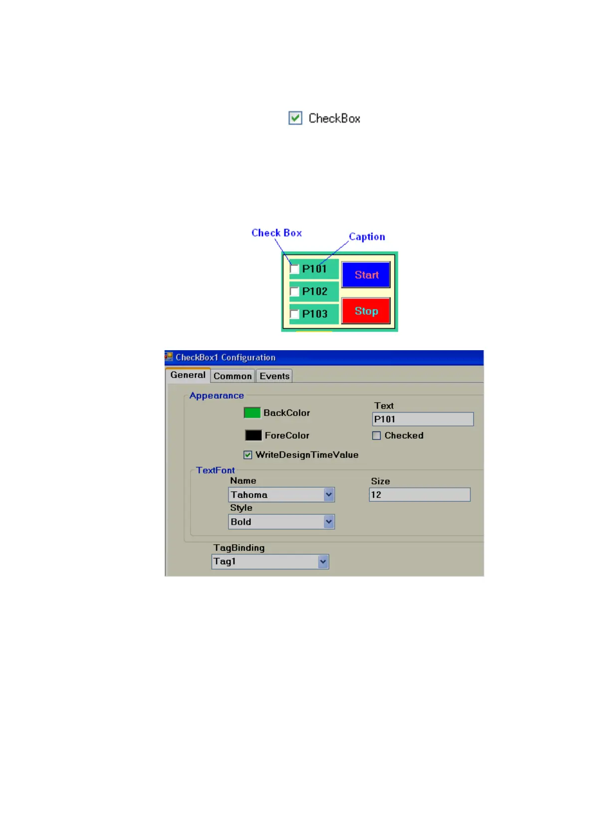 P101 for start-up. Using the check box, write a meaningful caption via the “TEXT” property to appear at the