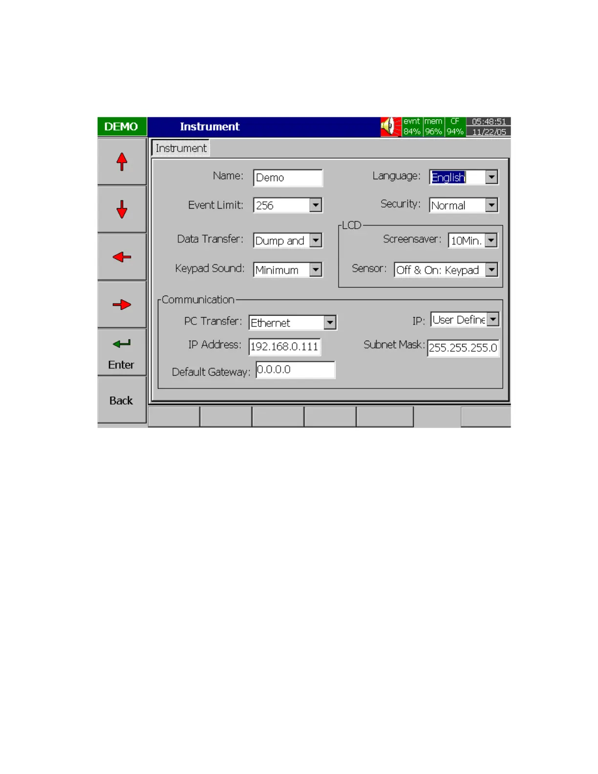 Press Back key, to return to the beginning of Configuration mode. Select Instrument then press Enter