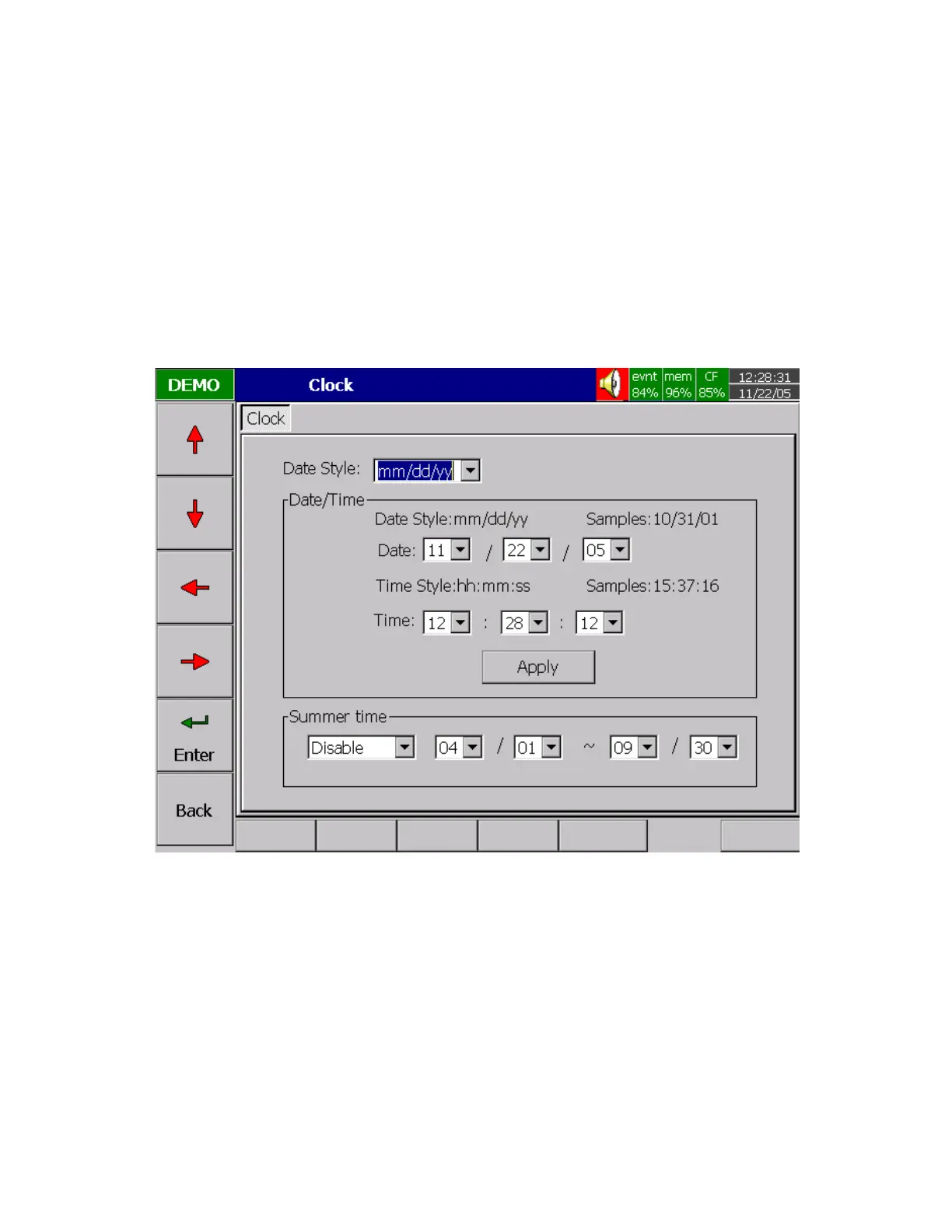 Date/Time: Set up the local time. Use directional keys going to the Apply column, and then press the