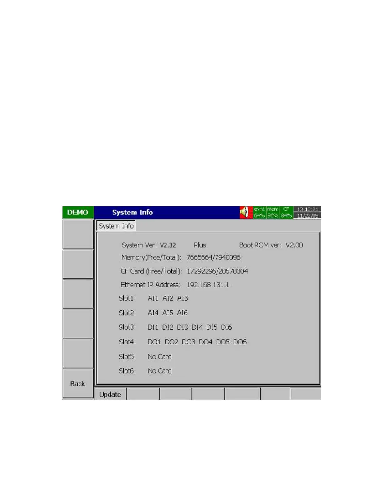 The system information includes System version, memory, CF card, Ethernet IP address and Slots status.