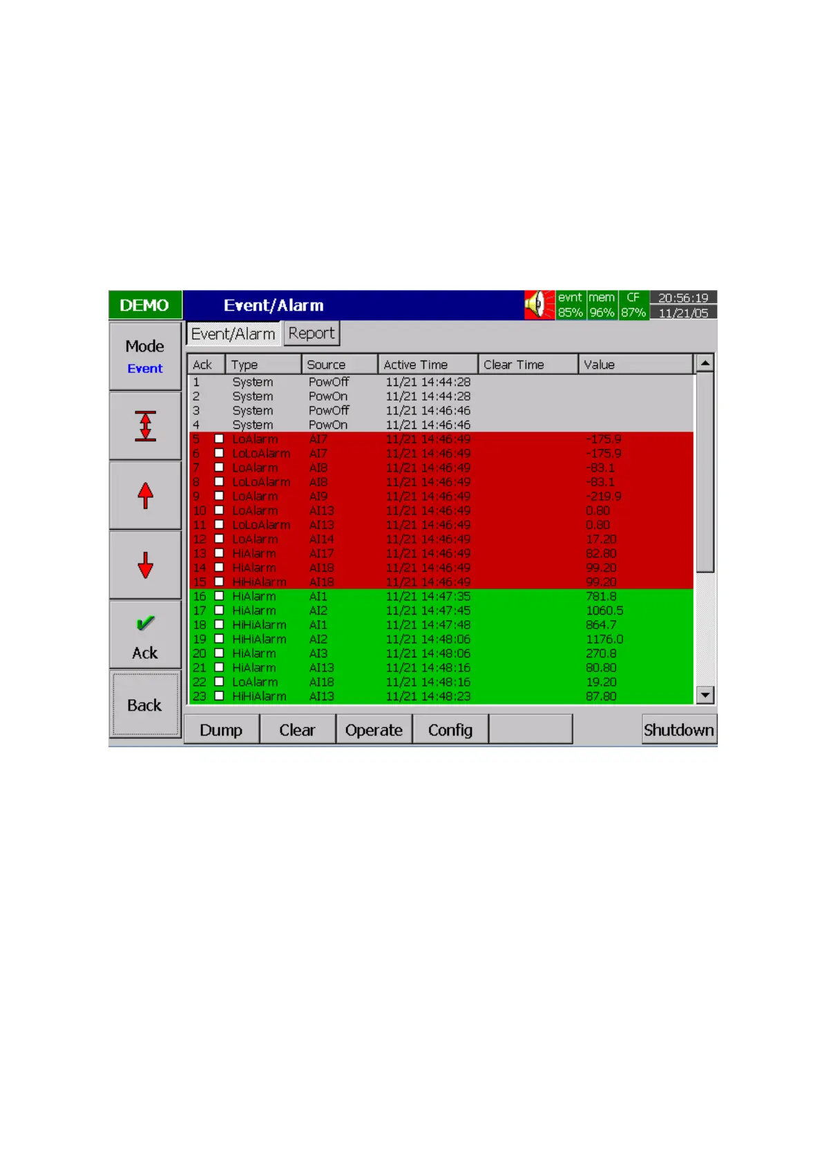 Press Event key, the Event /Alarm List displays general Events, Alarms and Reports. Press Mode key to