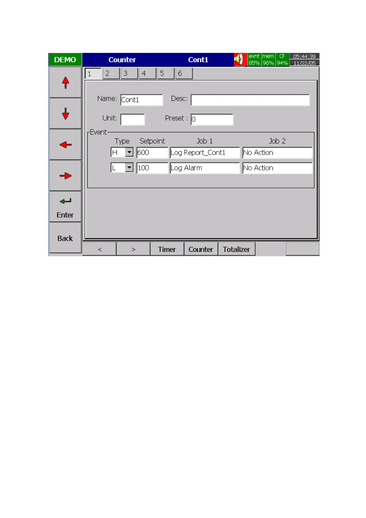 Event: Defines the type, setpoint, Job1 or Job2.