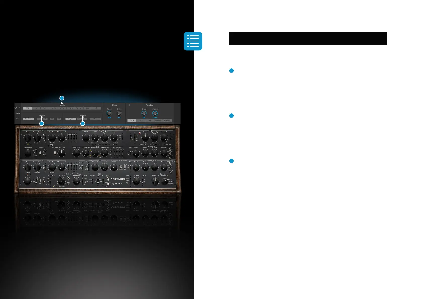 Legato: adding or releasing a note will not retrigger the Arpeggiator, while