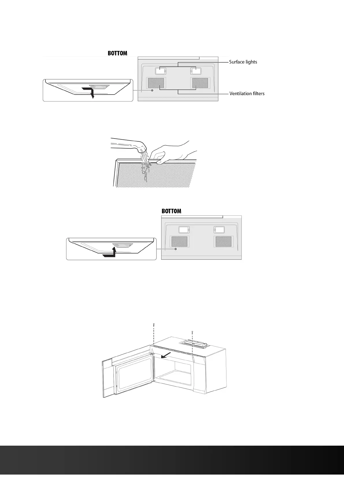 1. To remove the exhaust filters, slide the filter toward the back of the microwave and then pull