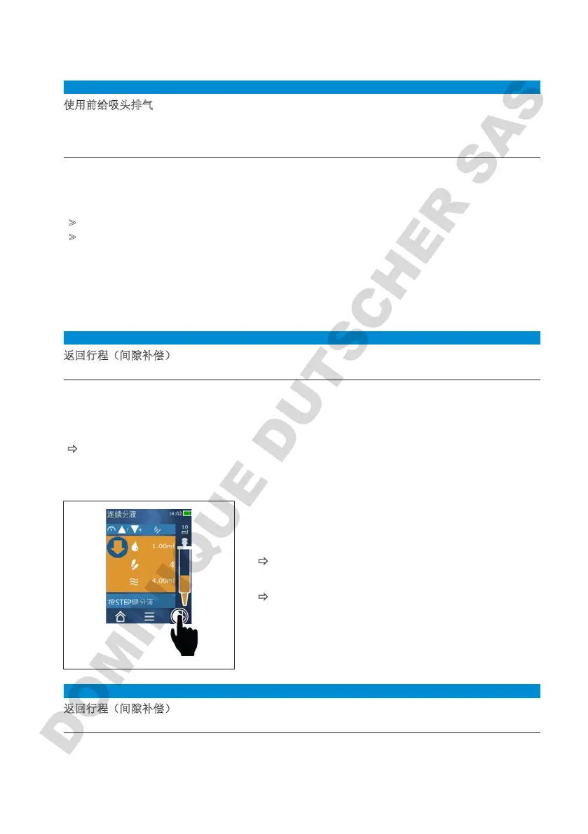 填充,在吸头为空时填充吸头,页227 并中断填充,停止填充吸头,页227)。排气后,活塞区域