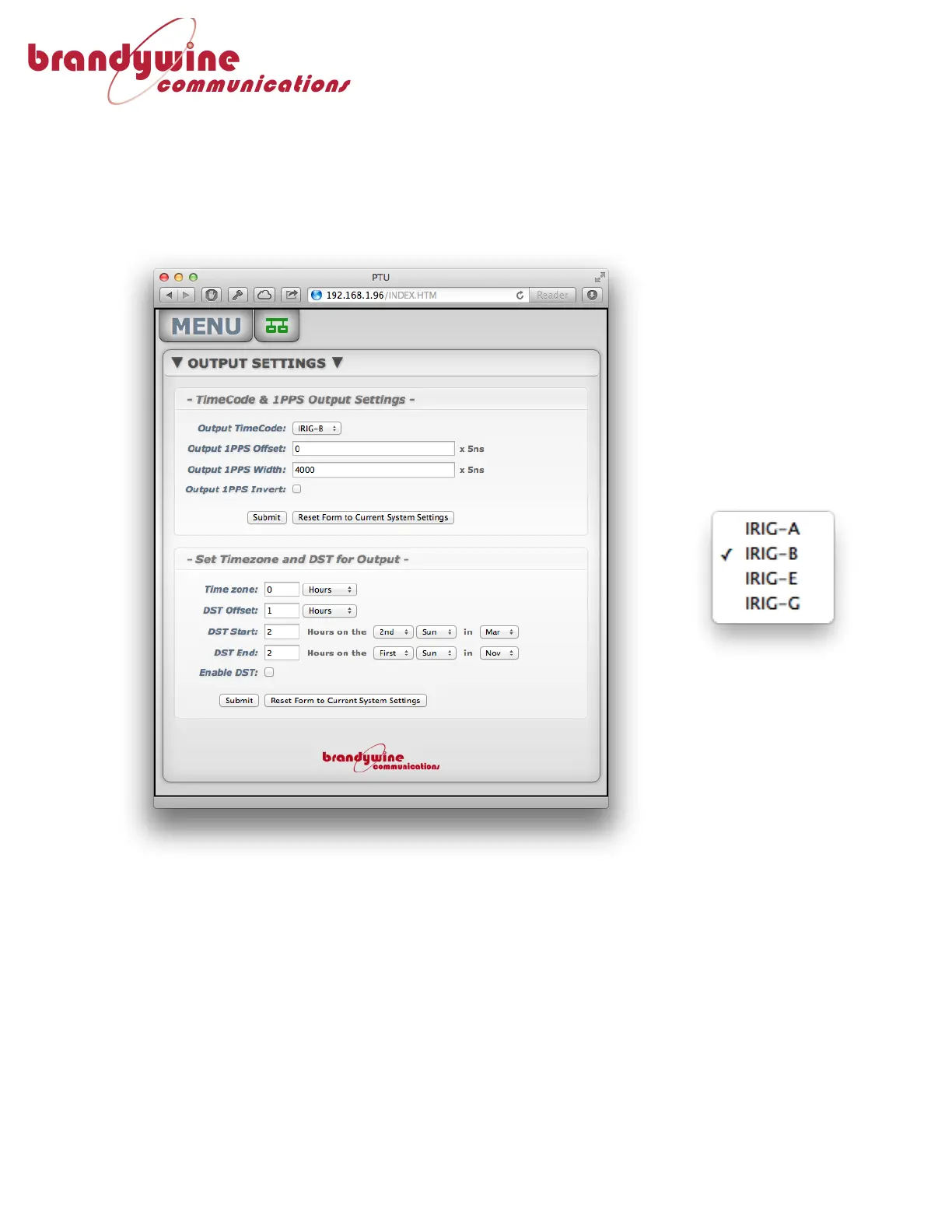 Brandywine Portable Timing Unit - Output Signal and Timezone Settings