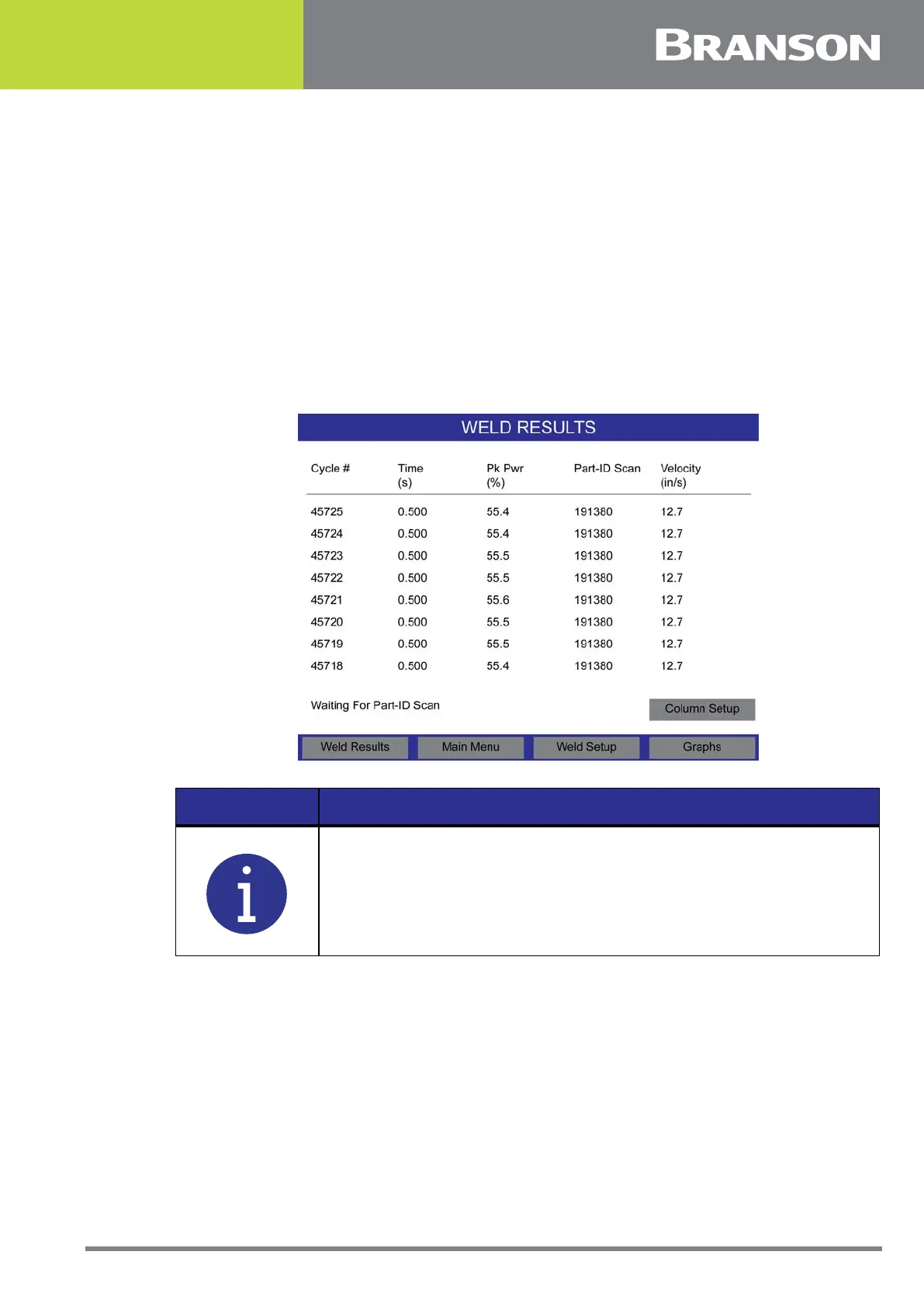 Pressing the Weld Results button displays the cycle number and 4 user configurable