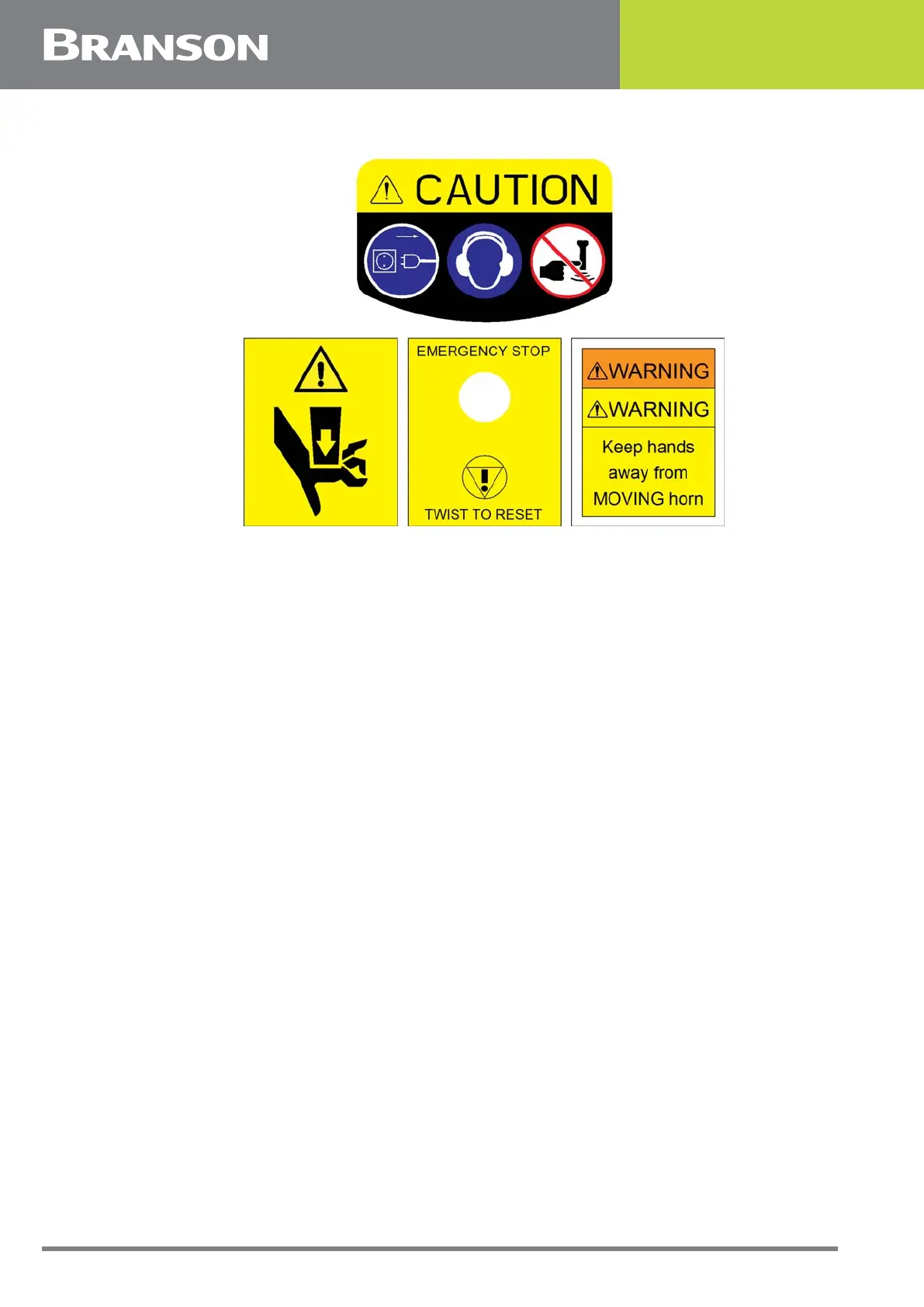 Branson 2000Xc - Figure 1.5 Safety Labels on Front of the 2000 Xc Actuator