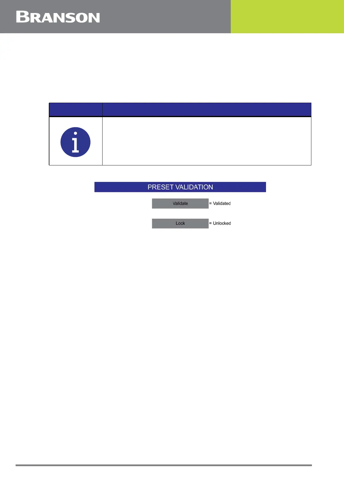 requirements for the current weld. Any change to a validated preset will cause it to