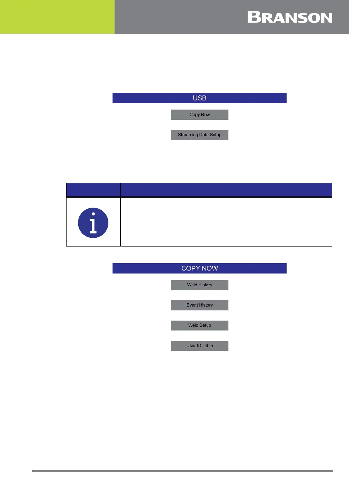 Use this menu to copy Weld History, Weld Setup, Event History, and User ID Table in PDF