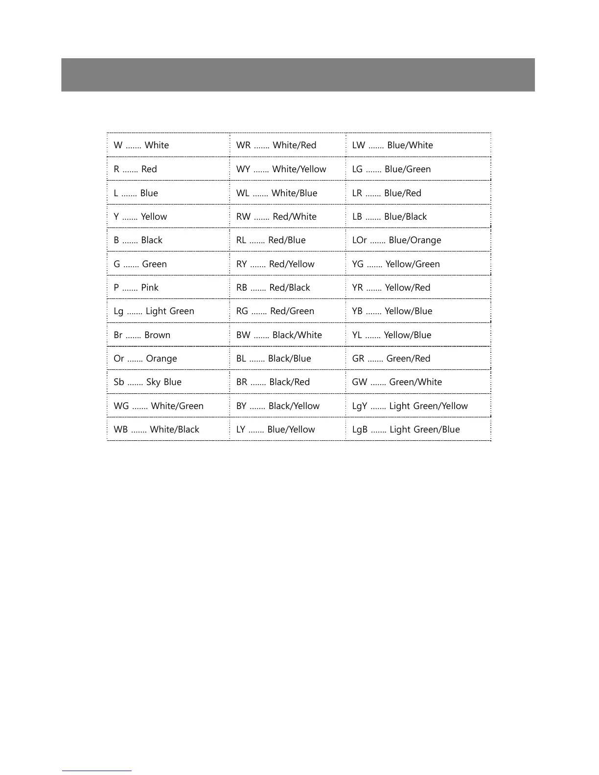 R ……. Red WY ……. White/Yellow LG ……. Blue/Green