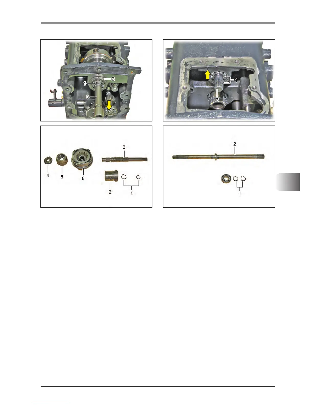 5. Remove the PTO clutch shaft snapring (1) and