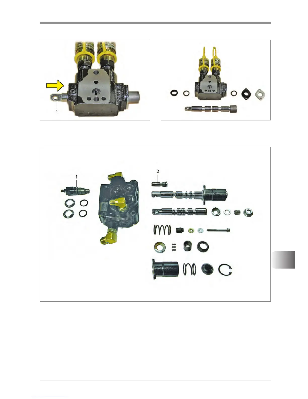 4. Unscrew the relief valve (1) from the other side to remove it. Then, pull the spool (2) to remove it.